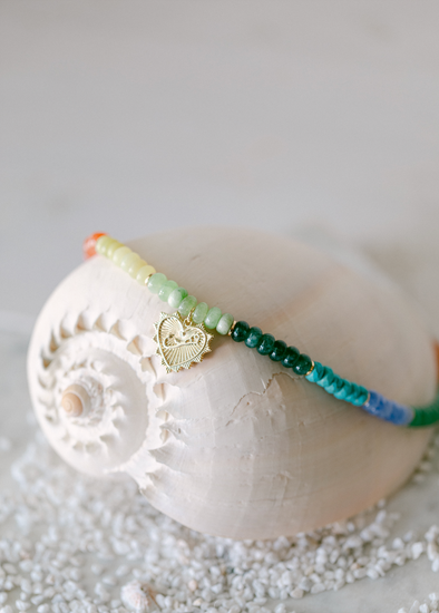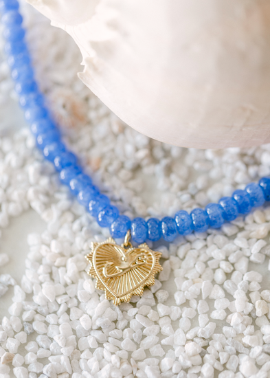 Each necklace is strung with radiant, hand-selected stones that echo the vibrant hues of island life — from turquoise waters to coral blooms. At the center: a striking 18K gold-plated heart charm, etched with coastal detail and a sunray border that feels like a little beam of light you can wear.