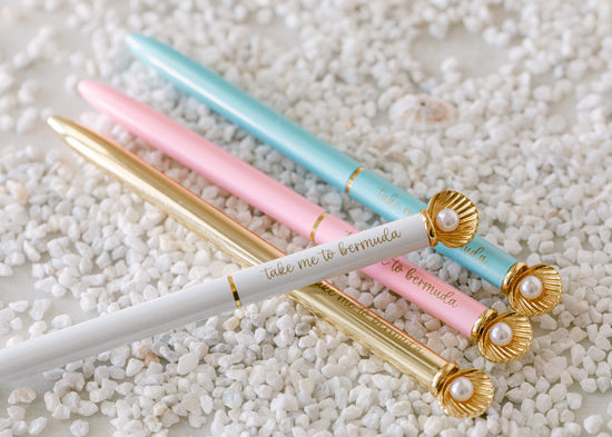 Introducing our Take Me to Bermuda shell pens—elegant, refined, and inspired by the calm of island life. Available in soft pastel tones of pink, blue, white, and gold, each pen is etched with the phrase “Take Me to Bermuda” as a quiet invitation to pause, dream, or reconnect. A gold clam shell with a delicate pearl detail crowns the top, adding a coastal sophistication that’s both charming and professional. Whether used in meetings, tucked into gift sets, or kept close for daily writing, these pens offer a subtle yet memorable way to bring a touch of Bermuda to your everyday.